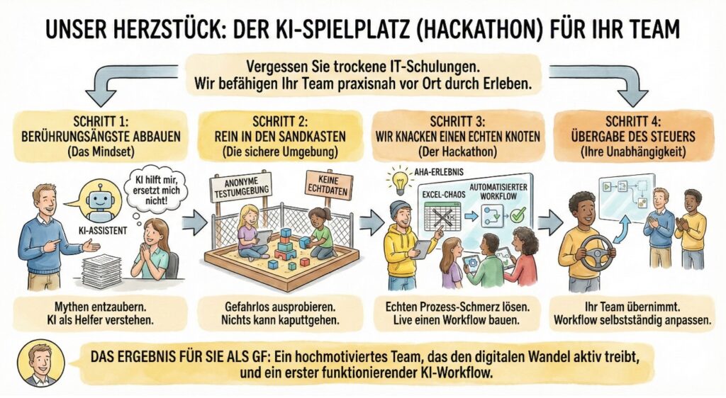 Das Ergebnis für Sie als Geschäftsführer: Am Ende des Hackathons haben Sie nicht nur die Skizze für Ihren ersten funktionierenden KI-Workflow, sondern vor allem ein hochmotiviertes Team, das den digitalen Wandel nicht mehr blockiert, sondern aktiv treibt.