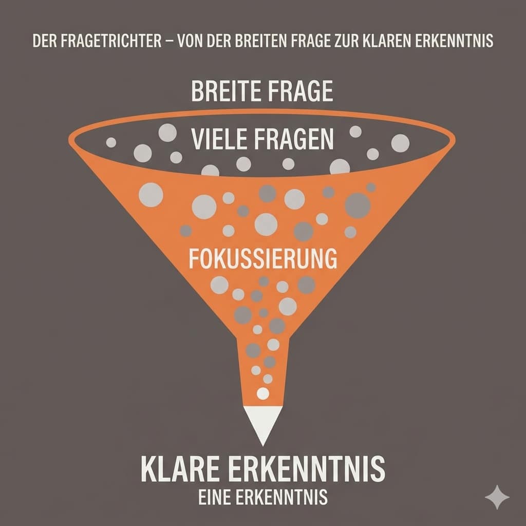 Der magische Fragetrichter hilft die richtigen Fragen zu stellen, um einen ganzheitlichen Überblick über eine Situation oder ein Problem zu bekommen.