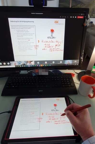 Auf dem einen habe ich meine Präsentation gesehen inkl. aller Teilnehmer, auf dem anderen habe ich mit meinem Stift auf dem Touchpad mitgeschrieben und gemalt, wie mit einem Whiteboard