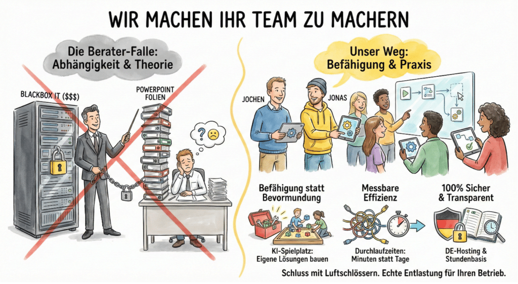 Die meisten Berater hinterlassen Ihnen ein teures IT-System, endlose PowerPoints und eine Abhängigkeit. Wir machen es anders. Wir hinterlassen Ihnen ein Team, das die Digitalisierung selbst im Griff hat.